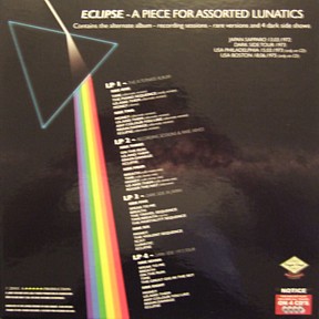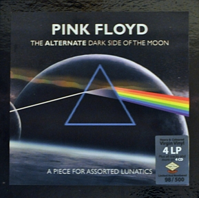 COMMENTS: EUROPEAN BOOTLEG DELUXE 3D BOX SET WITH 'DARK SIDE OF THE MOON' LIVE & STUDIO MATERIAL. 500 COPIES PRESSED ON COLOUR VINYL (ONE EACH OF DARK RED, BLUE & PURPLE VARIATIONS). THE BOX ALSO CONTAINS ALL TRACKS ON 4 CD'S WHICH ALSO HAVE 'DARK SIDE' SETS FROM PHILADELPHIA 15-03-1973 & BOSTON 18-06-1973.