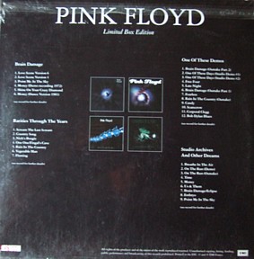 COMMENTS: EUROPEAN BOOTLEG COMPRISING OF FOUR SEPERATELY RELEASED ALBUMS IN ONE DELUXE COLOUR BOX WITH ADDITIONAL POSTER. ALBUM TITLES ARE 'BRAIN DAMAGE','RARITIES THROUGH THE YEARS', 'ONE OF THESE DEMOS' & 'STUDIO ARCHIVES AND OTHER DREAMS'. ALL USE OFFICIAL LOOKING EMI FRANCE LOGO'S. 50 NUMBERED COPIES PRESSED ON COLOUR VINYL.