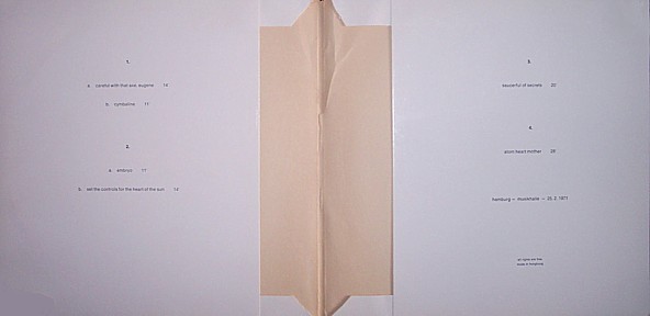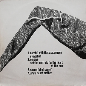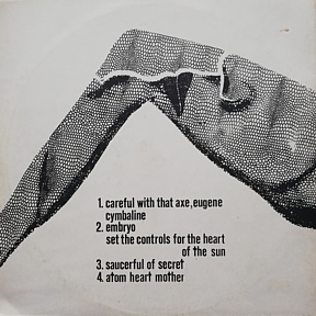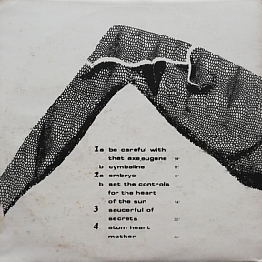 COMMENTS: GERMAN BOOTLEG RELEASED IN 1971. RECORDED AND PRODUCED BY ROBERT NITZ WITH ORIGINAL ARTWORK BY CARL-THOMAS WIESE. TITLED SIMPLY 'PINK FLOYD' IT IS REFERRED TO BY COLLECTORS AS 'SPREAD LEGS COVER', 'OBSCENE COVER' & 'M-502'. LATER PRESSINGS SUFFERED FROM DISTORTION DURING LOUD PASSAGES OF MUSIC PROBABLY DUE TO WORN PRESSING PLATES. THE ORIGINAL SOURCE OF MANY OTHER BOOTLEGS INCLUDING 'TAKE LINDA SURFIN', 'MIRACLE MUFFLER', 'HAMBURGER', AND 'EMBRWO'. SCROLL DOWN FOR A FLOYDBOOTS INTERVIEW WITH THE COVER ARTIST CARL-THOMAS WIESE.
