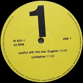 SIXTH AND SEVENTH PRESSINGS: THESE WERE THE LAST PRESSINGS. THE NAME PINK FLOYD APPEARED IN SLIGHTLY LARGER TEXT. THE NUMBER 2 IN THE M-502 MATRIX NUMBER LOOKS LIKE IT HAS BEEN CORRECTED ON SIDE FOUR. THE LABELS USED WERE EITHER YELLOW AND BLACK OR BLUE AND SILVER.